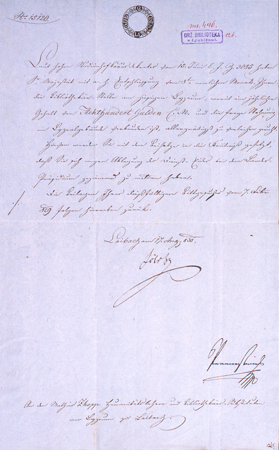 The government decree in which Matija Čop is named as the librarian of the Lyceum Library in Ljubljana.
